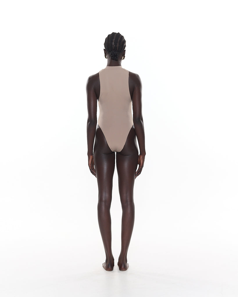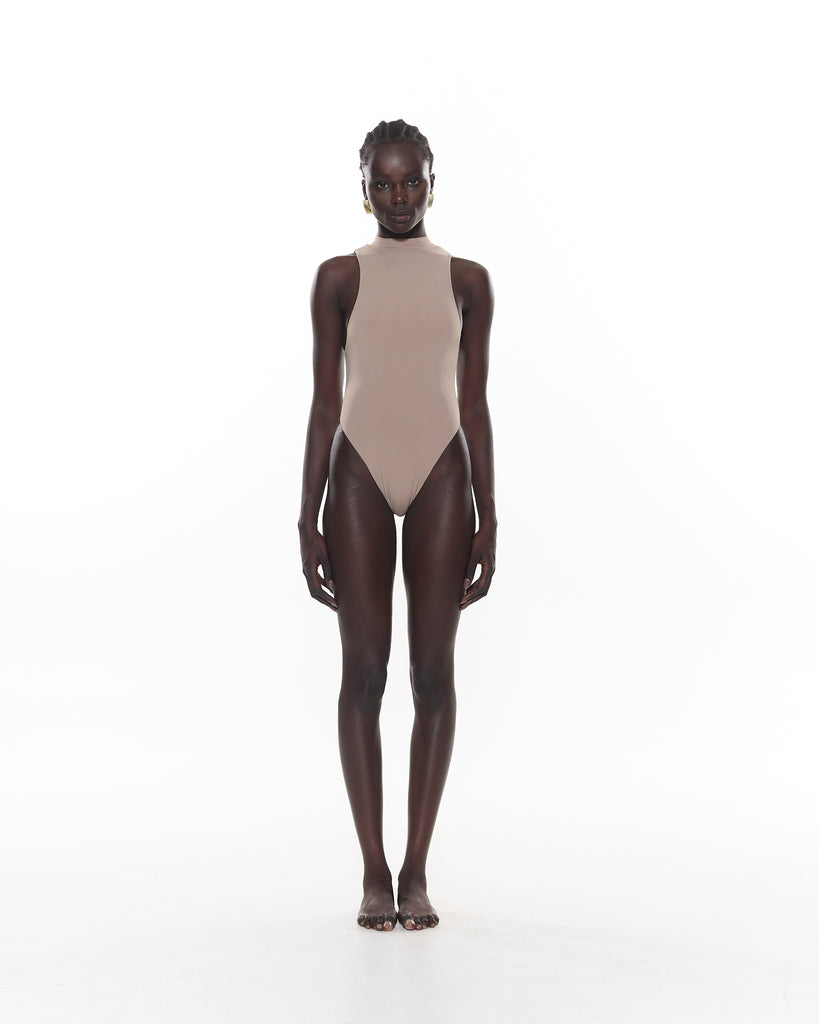 The Hadid High Neck One Piece features a high cut leg and mid coverage bottom.