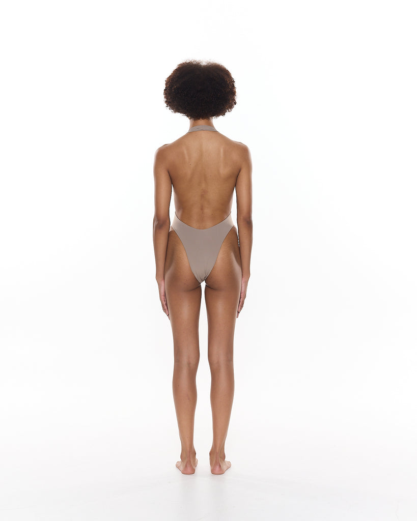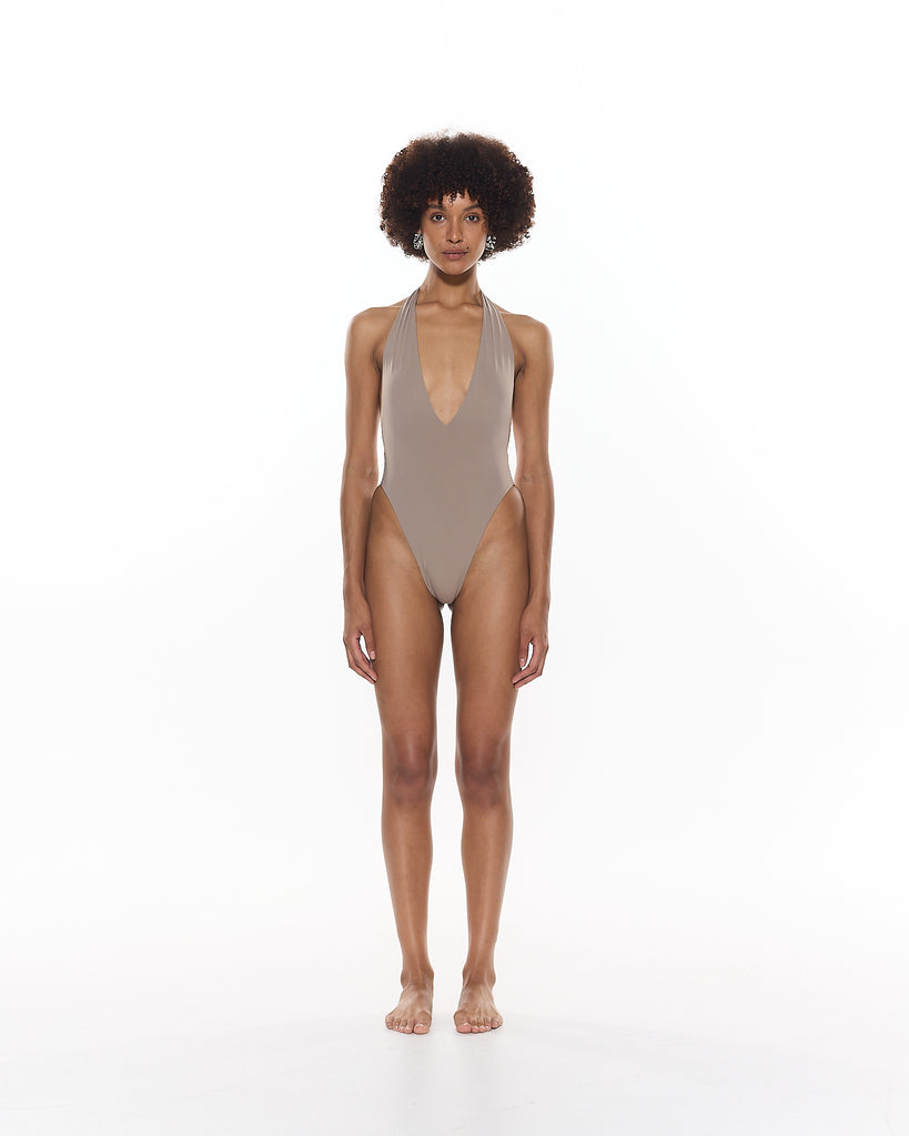 The Ralph Deep Plunge One Piece features a halter v neckline, open back and minimal coverage bottom.