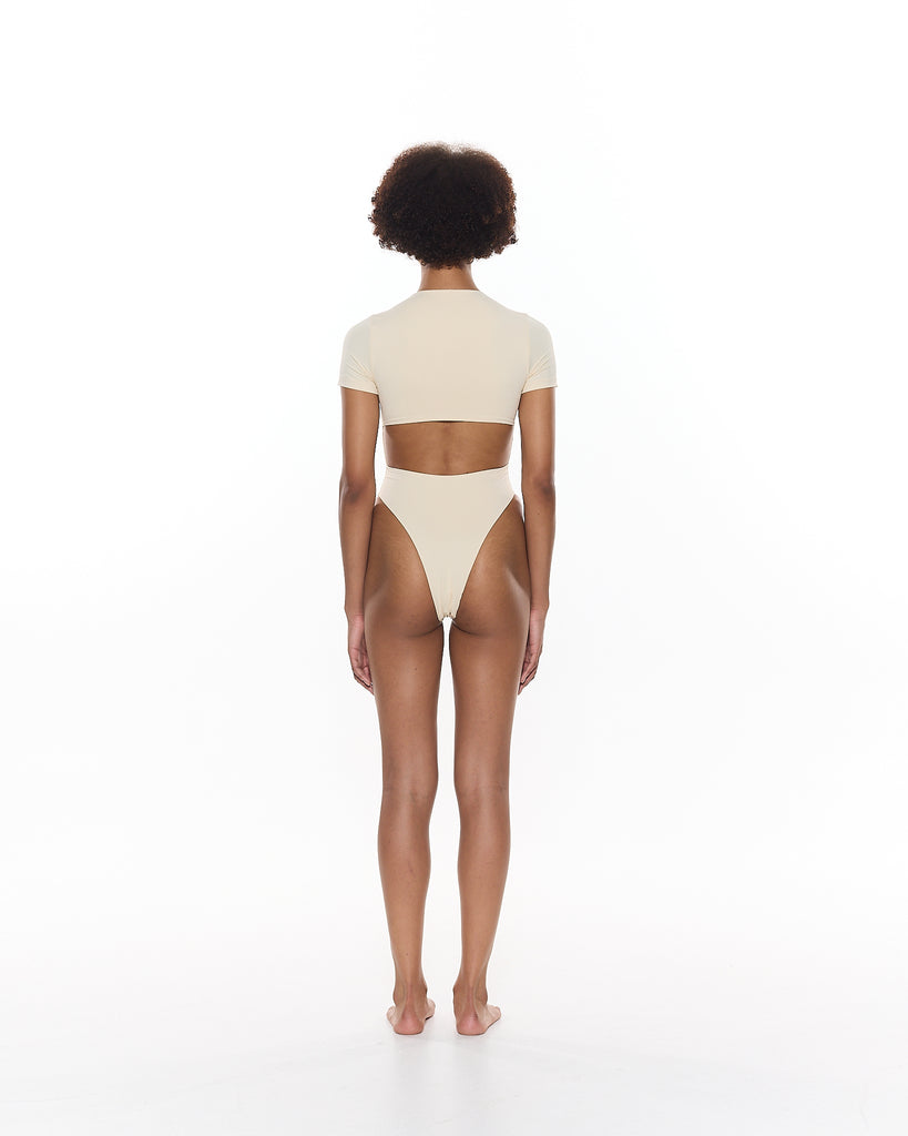 The Atlas is a t-shirt-style One Piece that features a sleek cut-out back and a mid-coverage bottom.