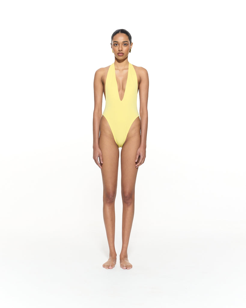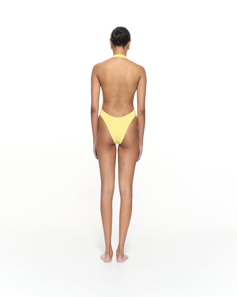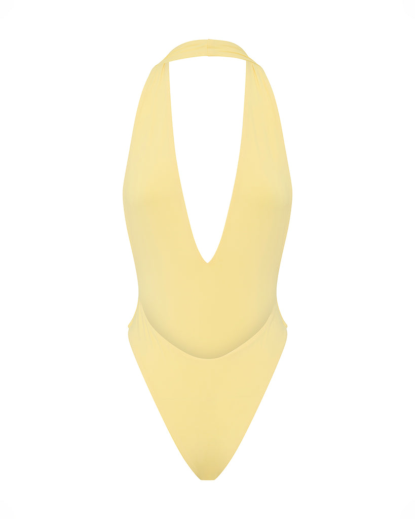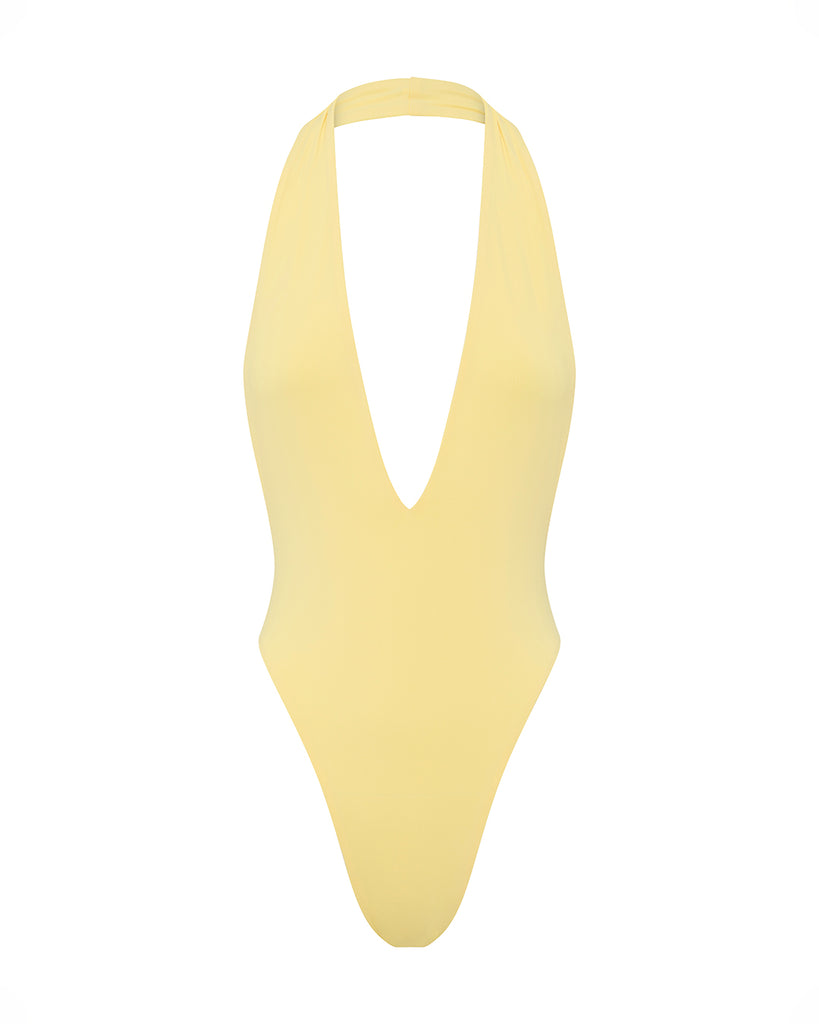 The Ralph Deep Plunge One Piece features a halter v neckline, open back and minimal coverage bottom.