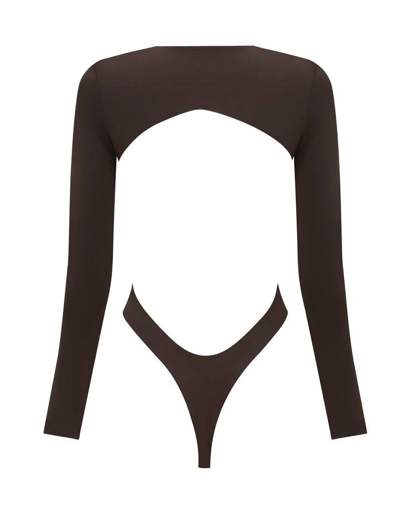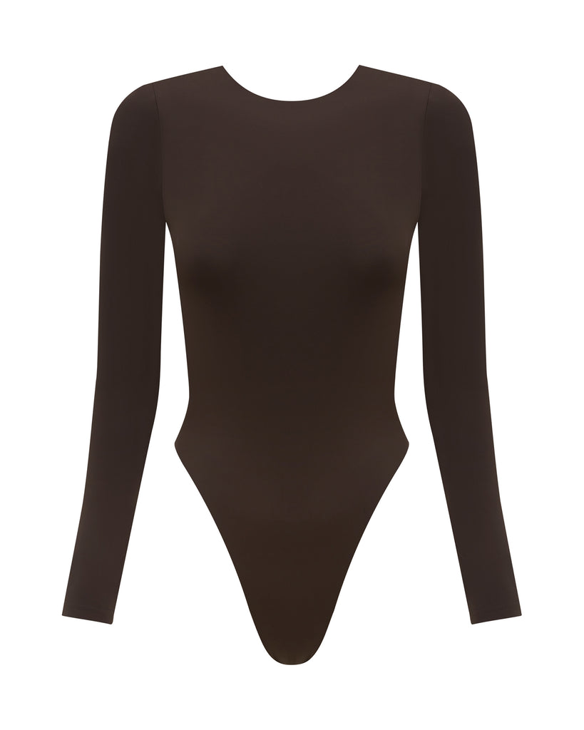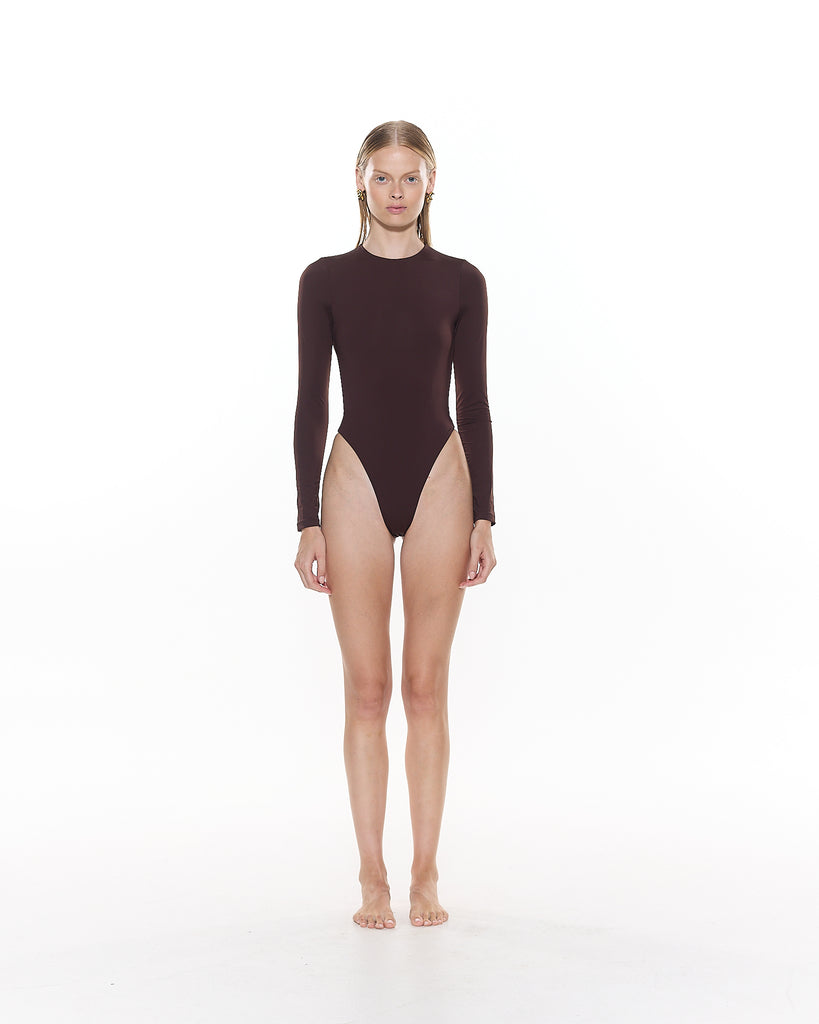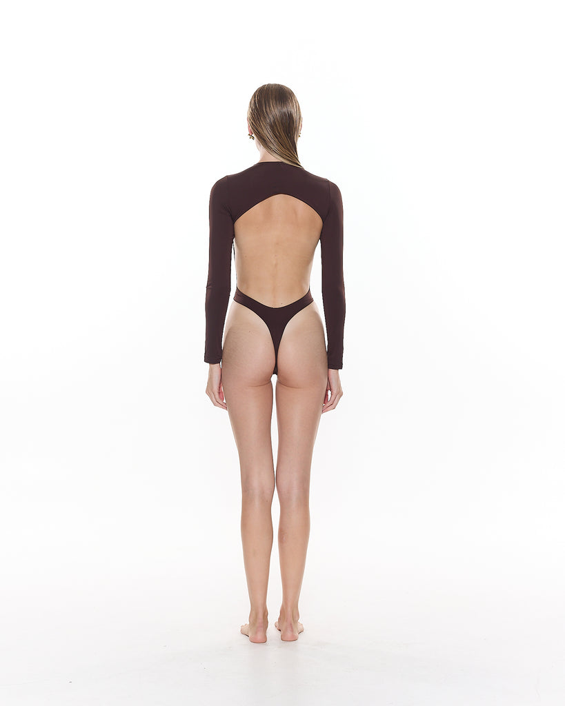 The Zuri Long Sleeve One Piece features a high leg cut, open back and thong coverage bottom.