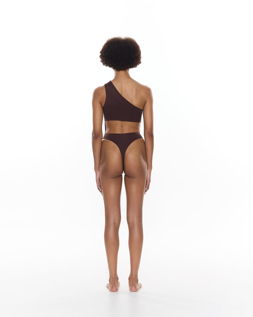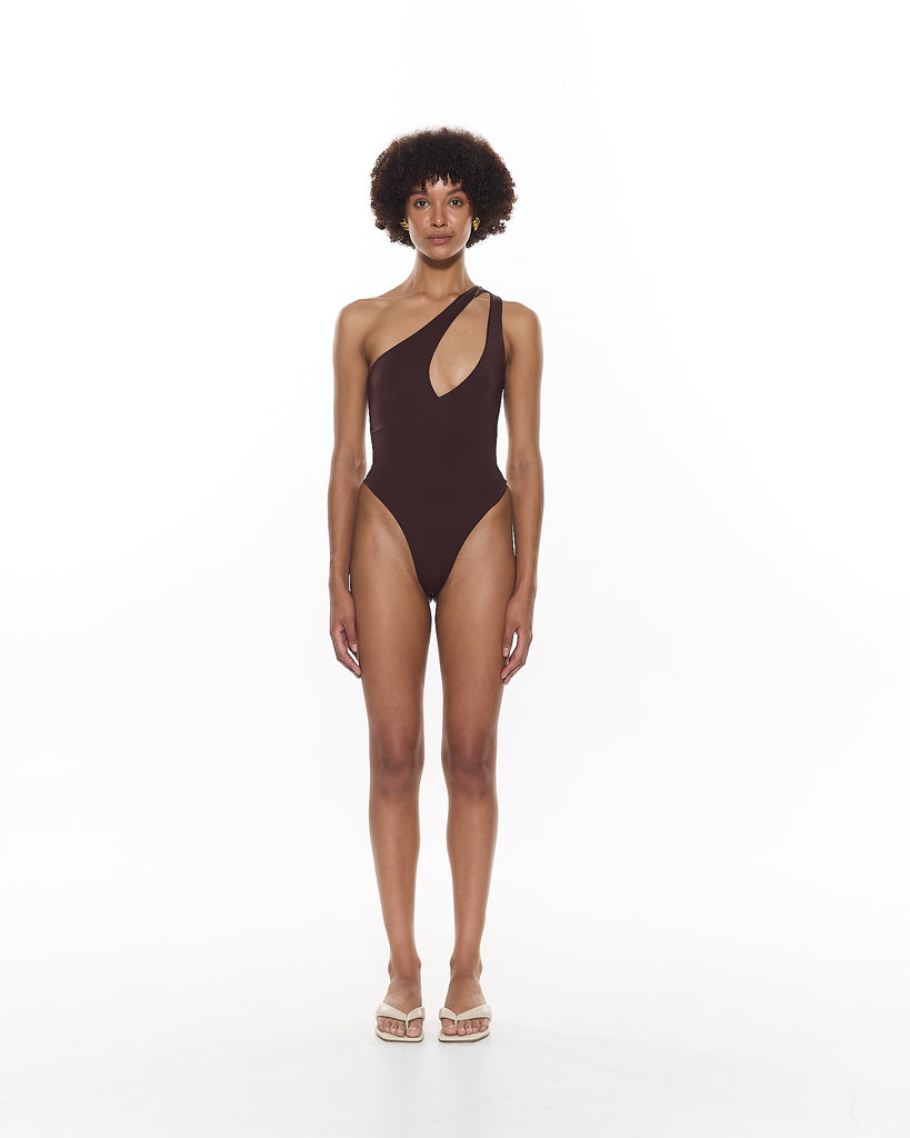 The Jett Asymmetric One Piece features a shoulder cut-out, high leg cut and thong bottom.