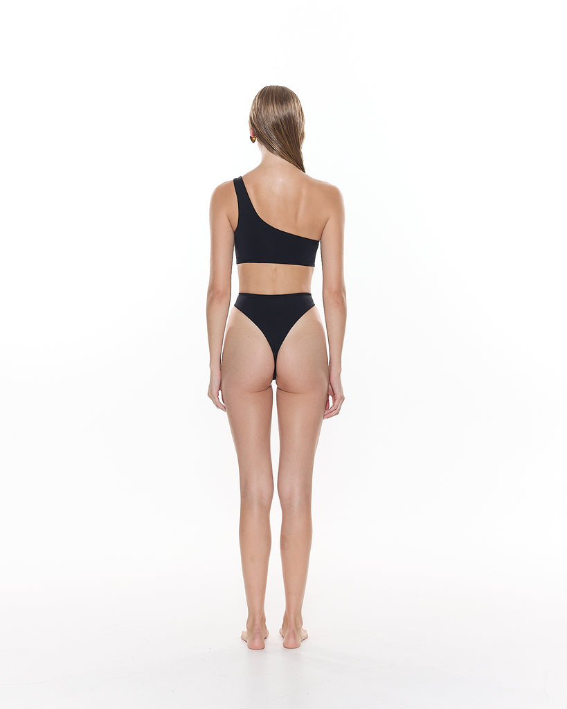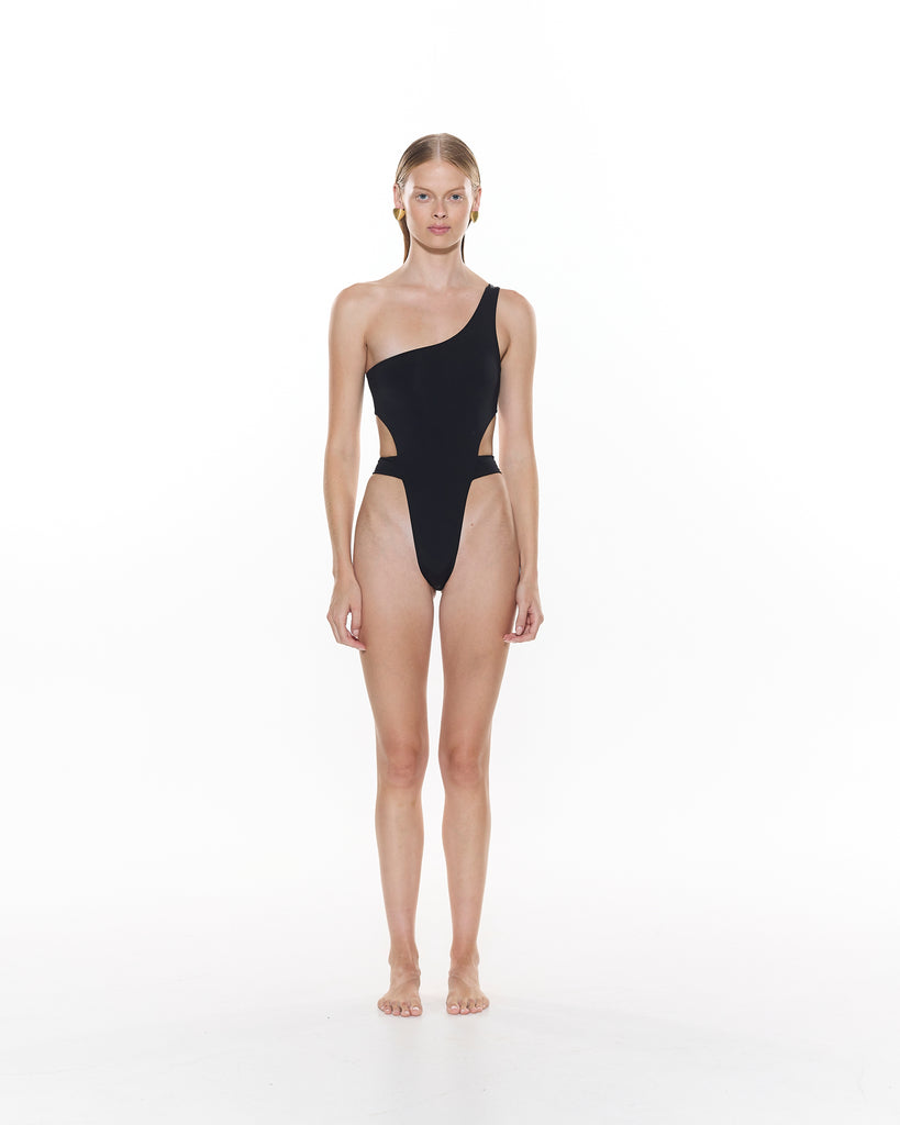 The Borne One Piece is a one-shoulder style that features a distinct high-cut leg and cut-out detailing to provide a minimal-coverage look.