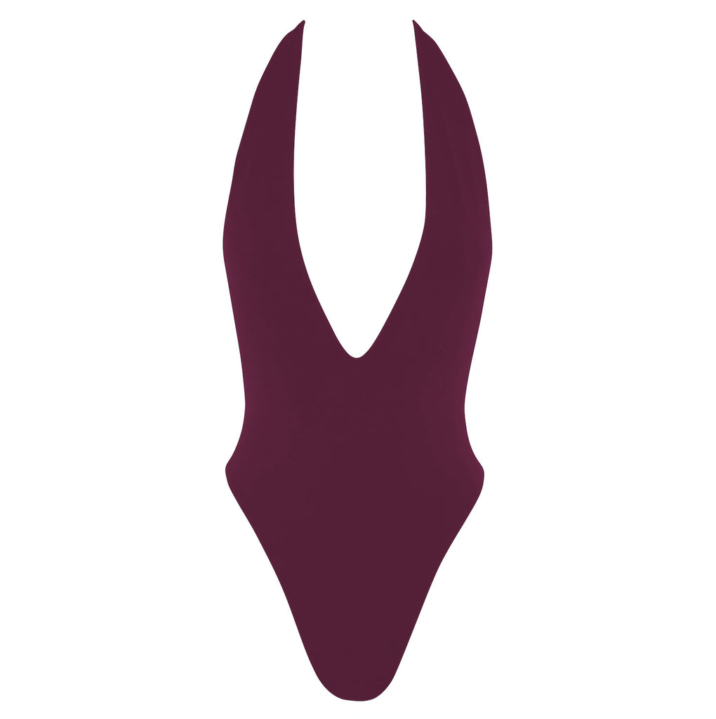 The Ralph Deep Plunge One Piece features a halter v neckline, open back and minimal coverage bottom.