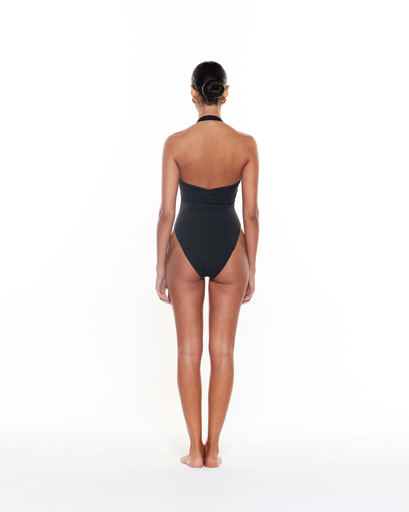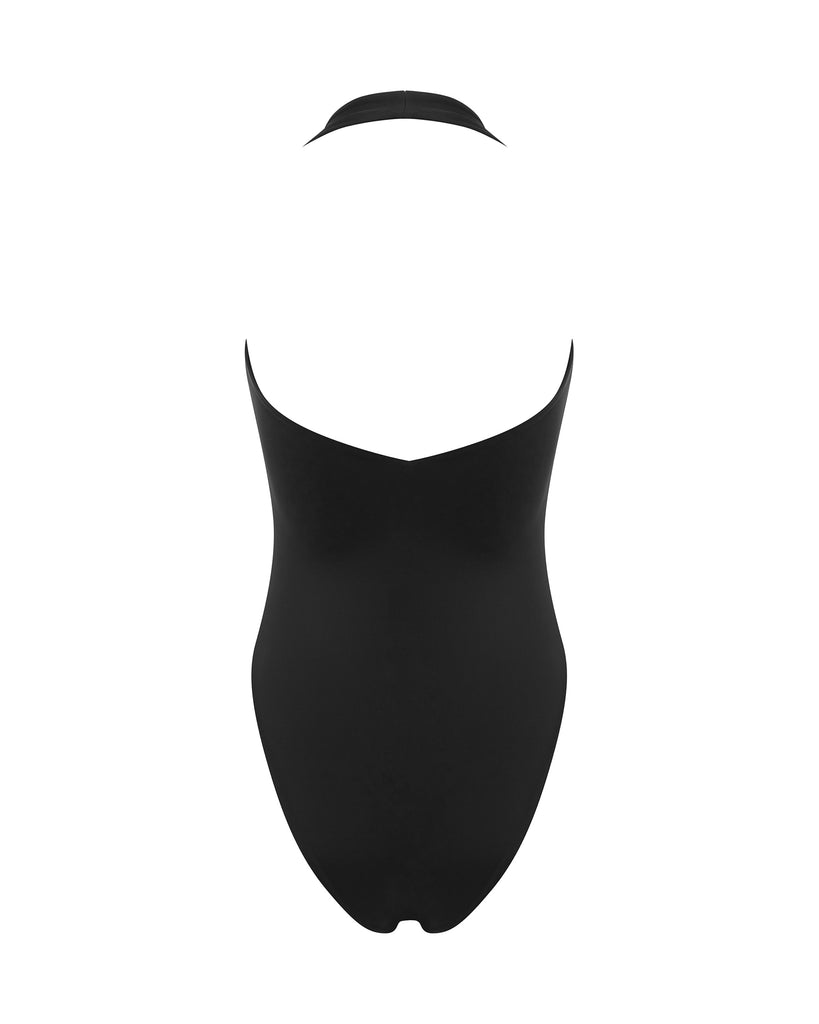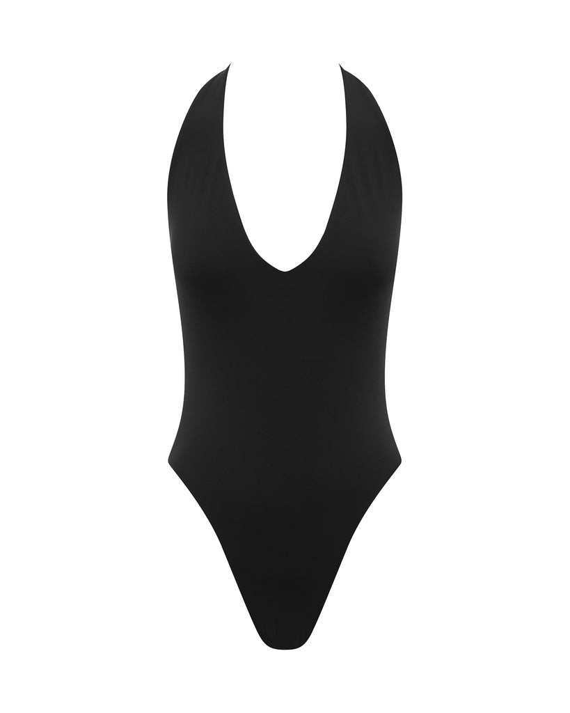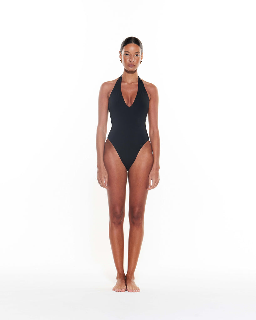 The Ryder Halter One Piece Swimsuit features a v-neckline, open back and medium coverage bottom.