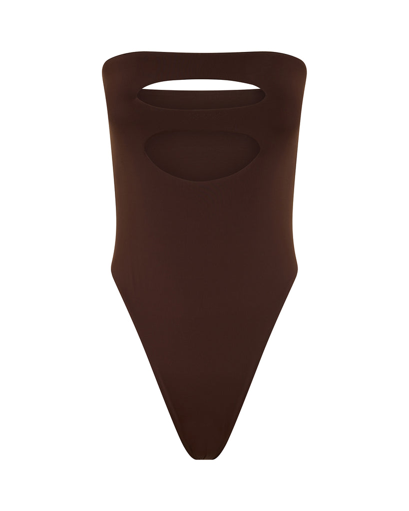 The Mavrik is a strapless design featuring a bust cut out detail, high leg cut and mid coverage bottom.