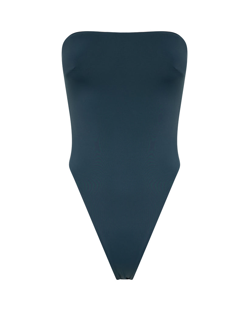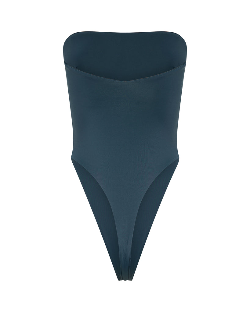 The Miry is a sculpting strapless one piece featuring a high cut leg detail and thong style bottom.