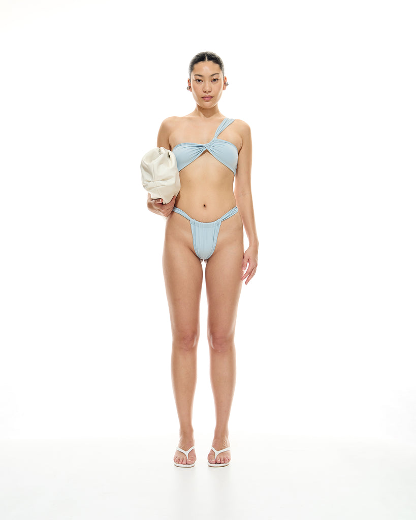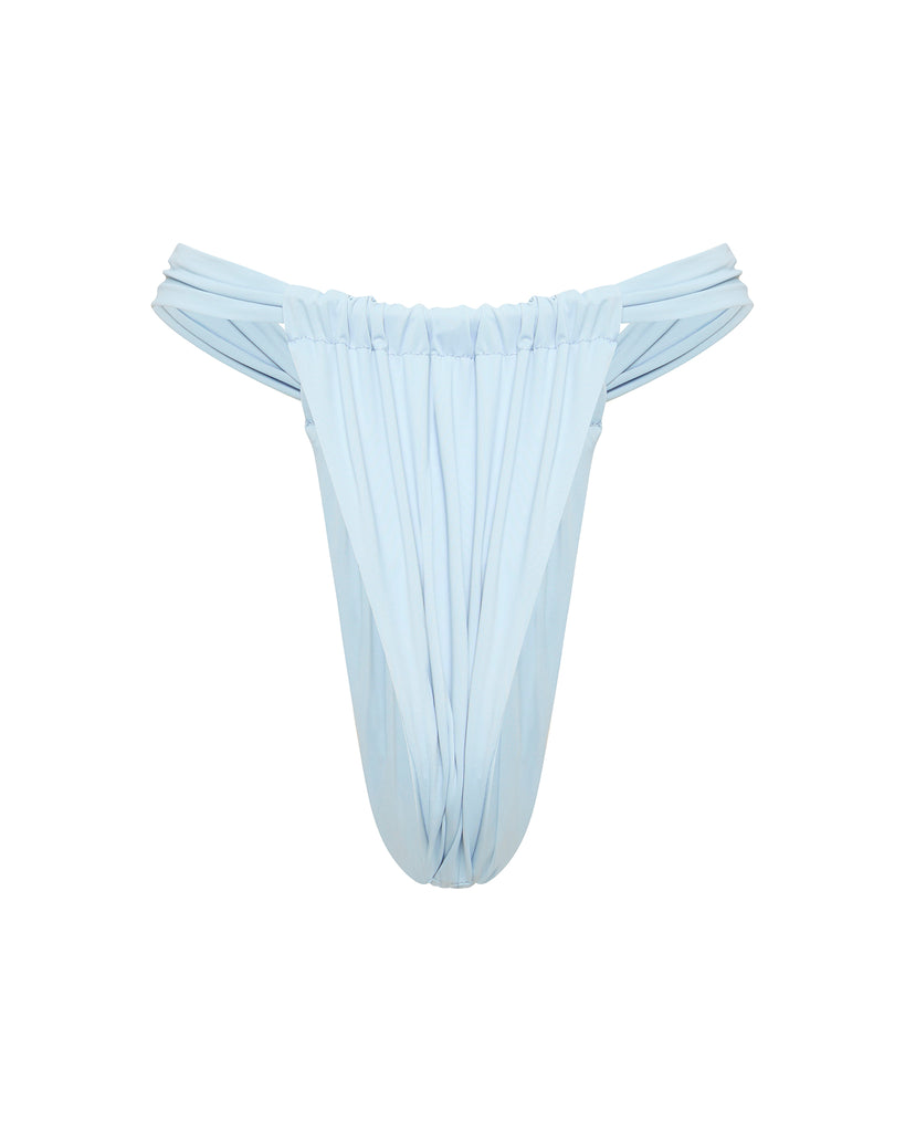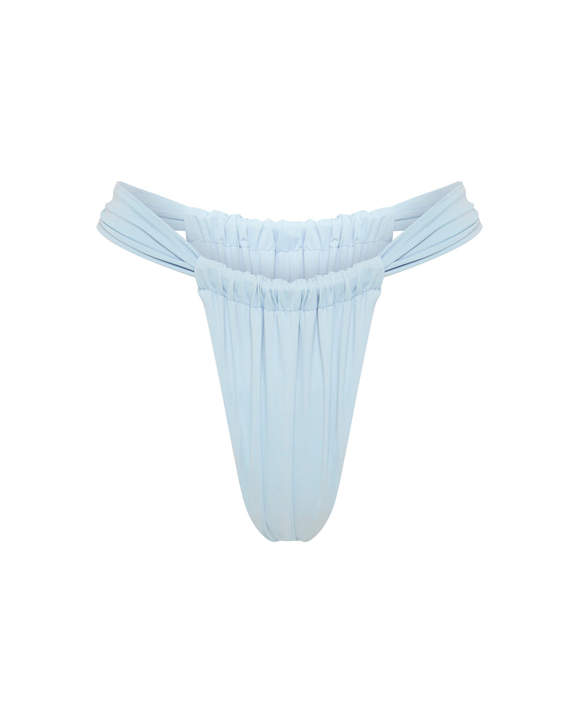 The Rio Ruched Thong Bikini Bottom features fixed sides and adjustable front and back coverage.