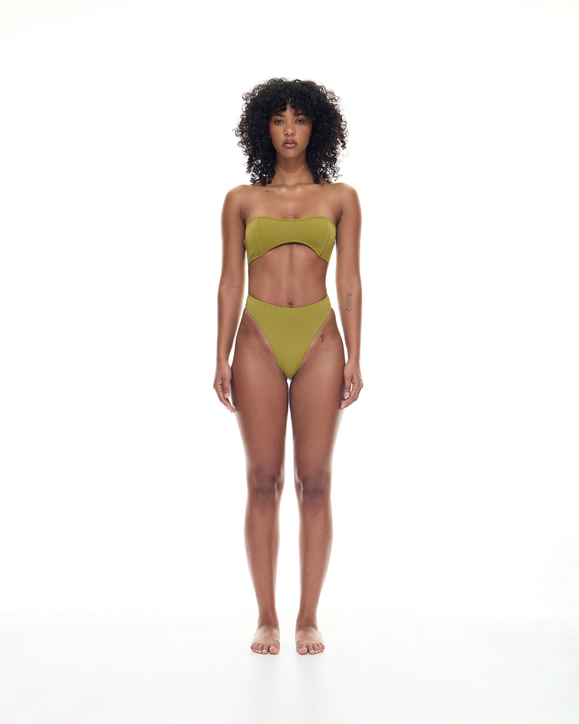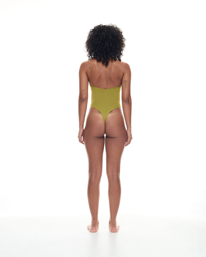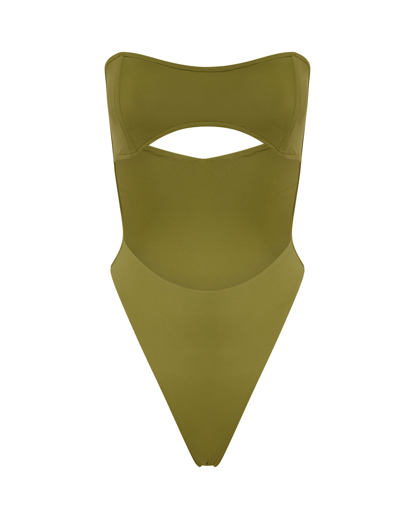 The Slash Strapless One Piece is a sculpting style featuring a cut-out detail, signature high leg cut and thong bottom.