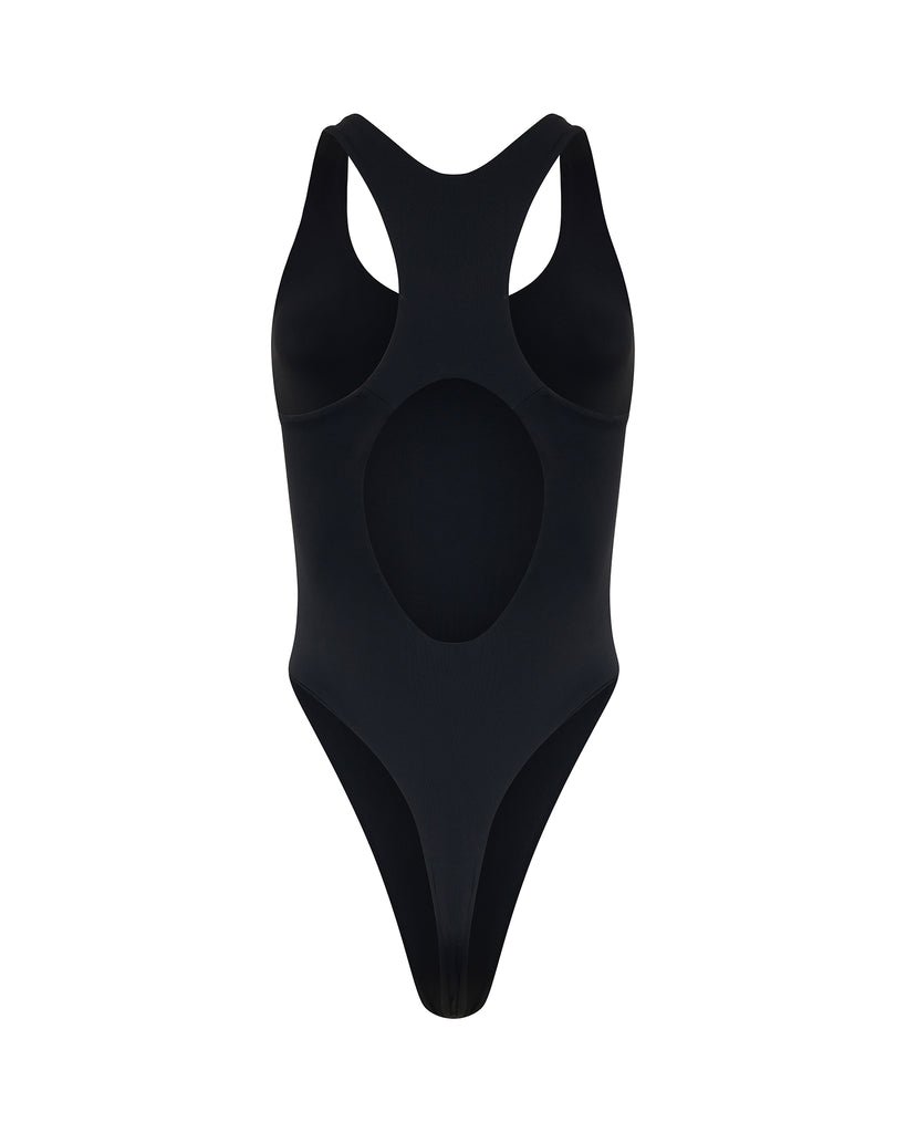 The Vae Scoop Neck One Piece features a high leg cut, racer-back detail and thong coverage bottom.