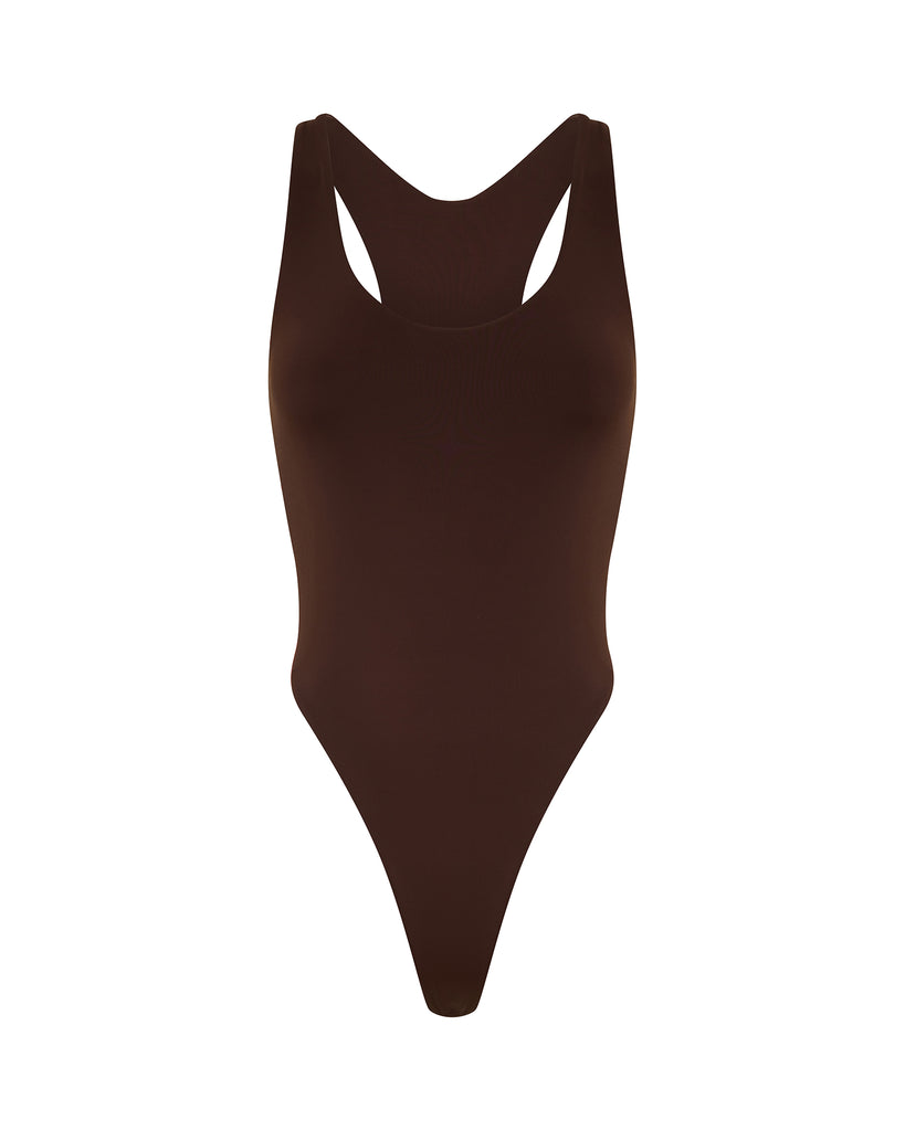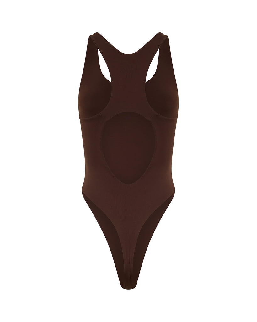 The Vae Scoop Neck One Piece features a high leg cut, racer-back detail and thong coverage bottom.