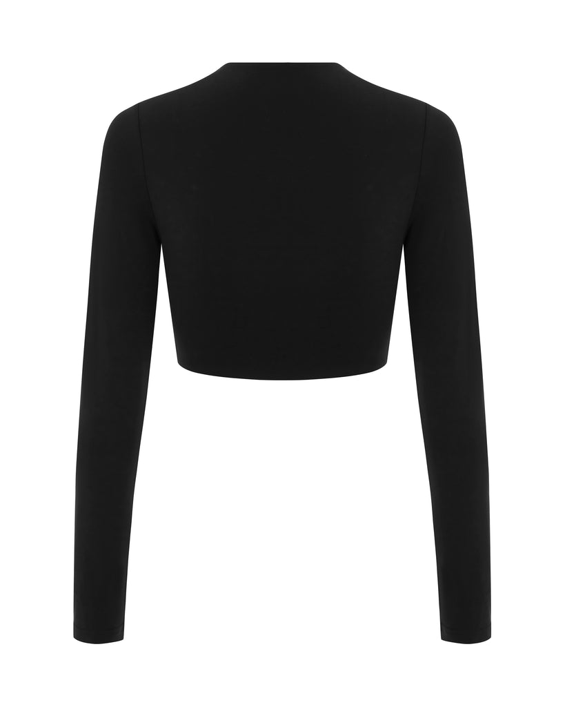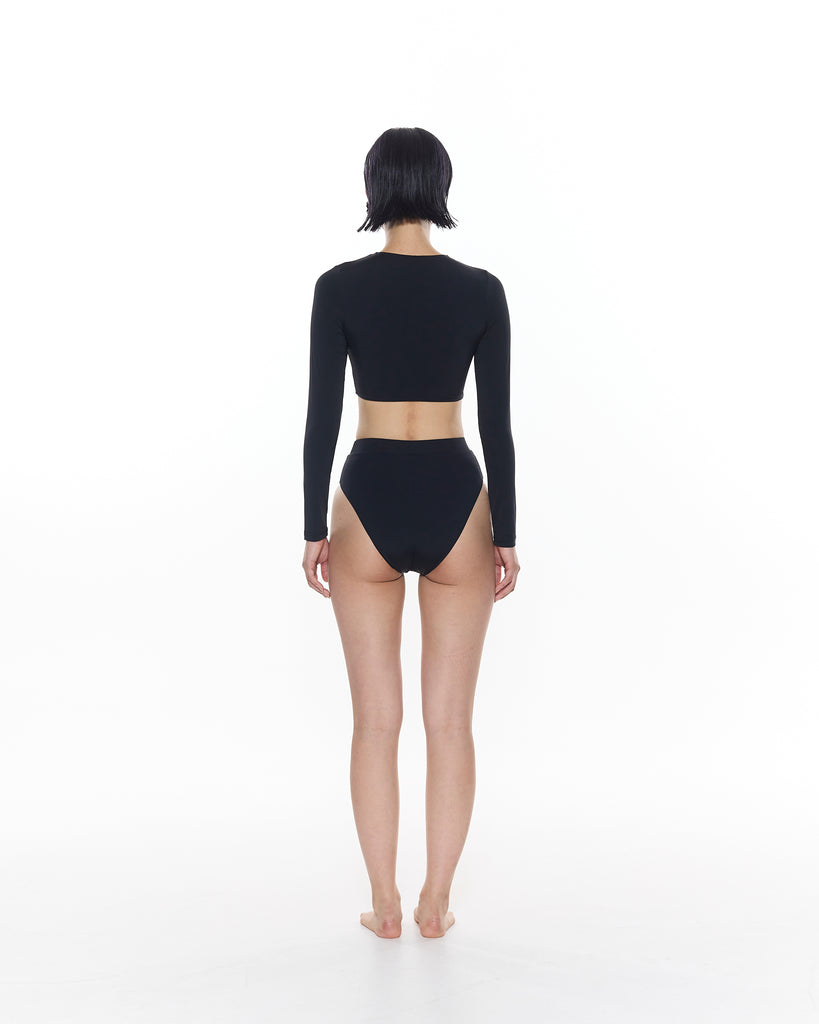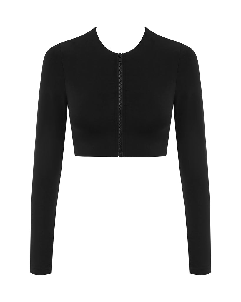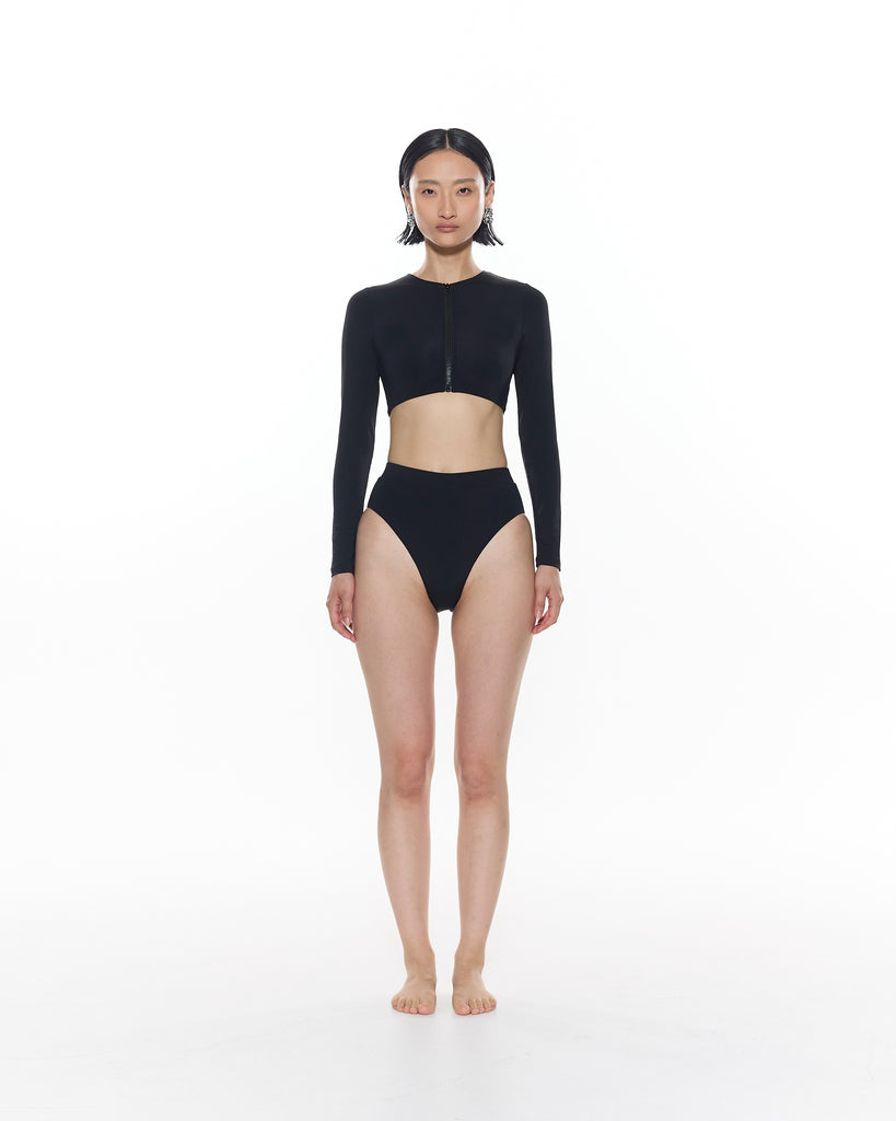 The Rita Long Sleeve Bikini Top features a functioning front zip detail and cropped length.